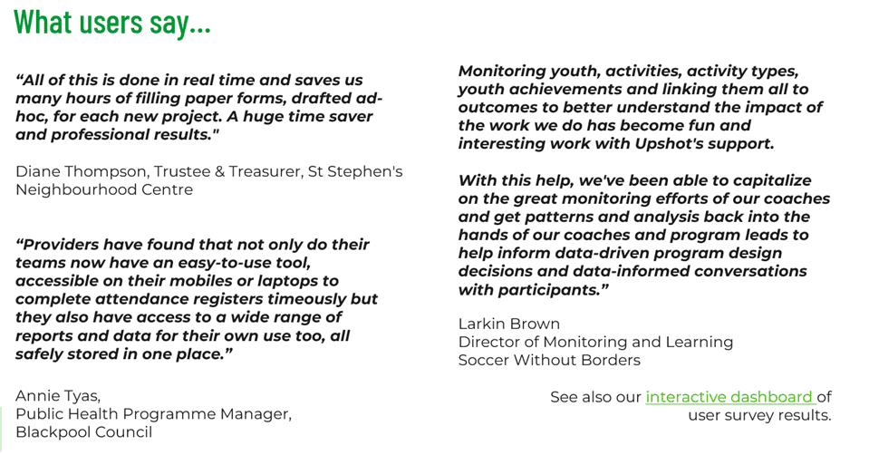 Upshot is a non-profit CIC: our vision is a global community of impact-led organisations using data and insight to better serve their communities. It support 1,800+ funders, sport and community groups, youth organisations, local authorities, NGBs and charities of all sizes in the UK and worldwide.